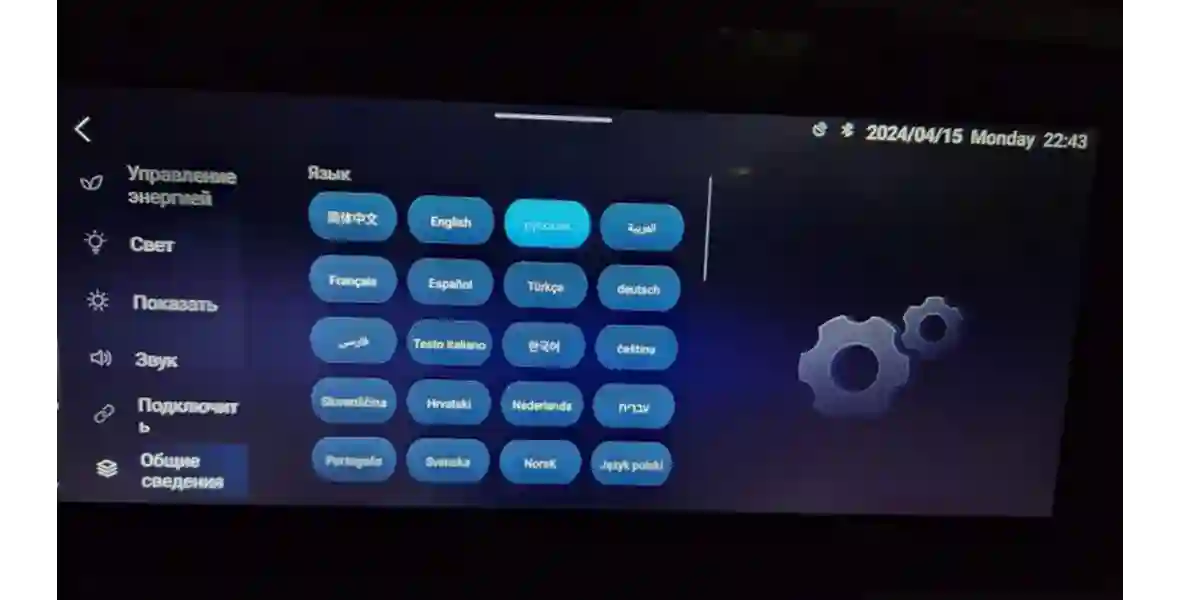 Отельных тем оформления у панели приборов нет, графика выглядит своеобразно, а шрифты местами мелковаты. Управление борткомпьютером на руле требует некоторой привычки, а сама менюшка тут на английском. При этом мультимедийная система русификацию получила. Более того, в настройках целых 20 языков на выбор, такое разнообразие я вижу впервые.